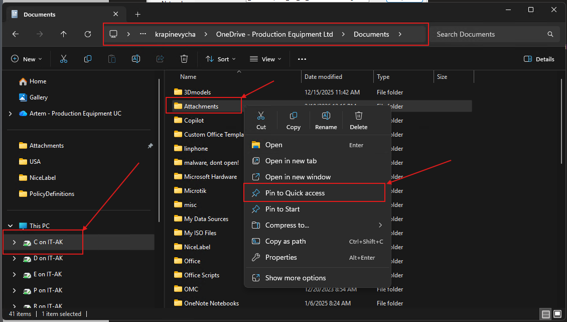 Once all removed, go to your Attachments root folder (one before) and pin it the same way by right-clicking and doing Pin to Quick access.