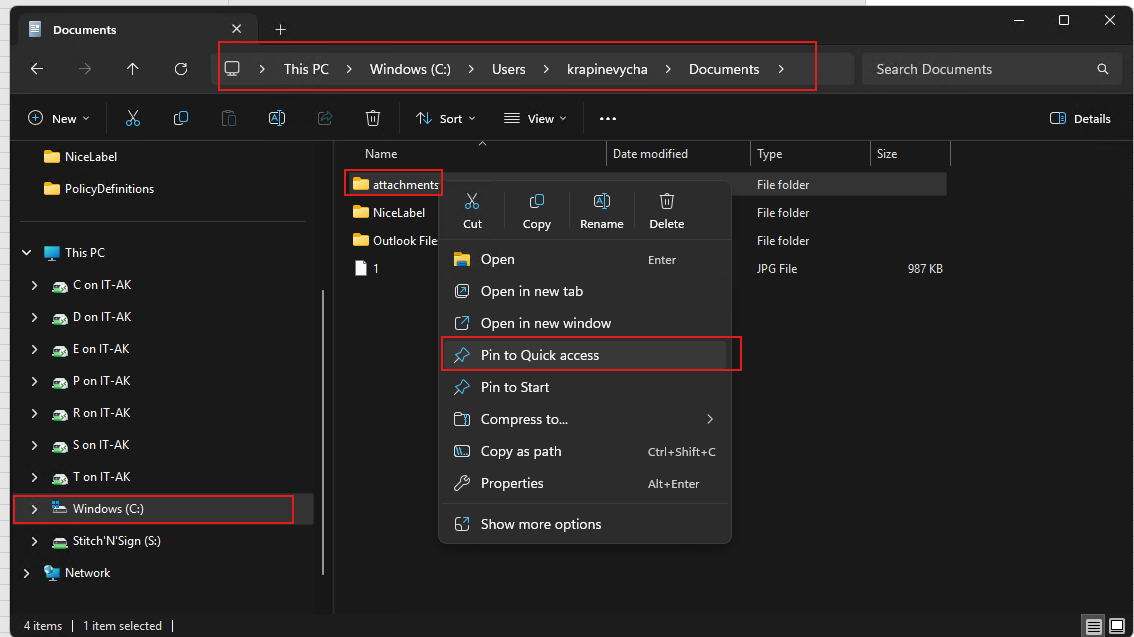 Once opened, make an attachments folder and Pin it to Quick Access.